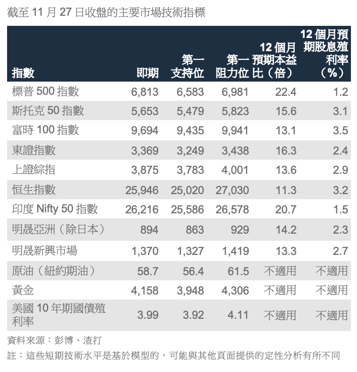 分散配置中國股票。美國股票的評價面過高,使分散配置股票顯得更重要。彭博的數據顯示,受科技行業62%的成長所推動,中國企業第三季的盈餘成長大幅回升至約10%,是一年來最強勁的成長。儘管短期前景仍受國內競爭以及美國可能對先進半導體出口實施制裁的影響,但我們將把握當前的市場盤整來增持中國股票。中國股票看似吸引,未來12個月的預測本益比較亞洲(除日本)股票有13%的折讓(參見第4頁)。英鎊面臨短期上行壓力,因英國預算案緩和了財政憂慮。英國秋季預算案引入了260億英鎊的加稅措施,財政大臣李韻晴(Reeves)強調,財政緩衝已從之前的90億英鎊提高至大約220億英鎊,以應付突發事件帶來的衝擊。額外的財政緩衝減輕了一些短期的不確定性,有助降低長期債券殖利率。我們預期英鎊兌美元在未來幾週將延續漲勢至1.34(參見第6頁)。