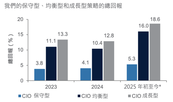 多元化策略有助應對風險上升:我們的多元化策略在充滿地緣政治與經濟衝擊的一年中表現亮眼,有關衝擊包括川普將關稅提高至近一個世紀以來的最高水平,德國作出歷史性的財政政策轉向,而中國的物價疲弱壓力加劇。在此背景下,我們專為願意承擔中度風險的投資者設計的均衡型策略,年初至今已達到16%的總回報,2024年和2023年的回報分別為10.4%和11.1%。我們今年大部分時間偏好黃金和股票的觀點獲得了豐厚的回報,這兩類資產的表現都有望超越債券和現金。事實上,黃金或會連續第十年表現優於全球債券,也有望在過去六年中第四次表現優於全球股票。