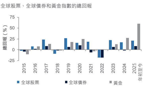 展望未來,儘管美股在年底的最後兩週往往表現最佳,但未來兩個月內有幾項事件皆可能引發市場波動,包括下週的聯準會政策會議、預期最高法院對關稅的裁決、以及總統川普提名下一任聯準會主席。黃金今年的表現有望大幅超越全球股票和債券,步入2026年,在不確定性的籠罩下,仍然是與股票並列的首選資產。