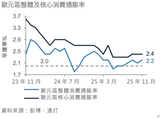歐元區整體通膨率在11月輕微上升,而核心通膨率則維持不變,符合預期