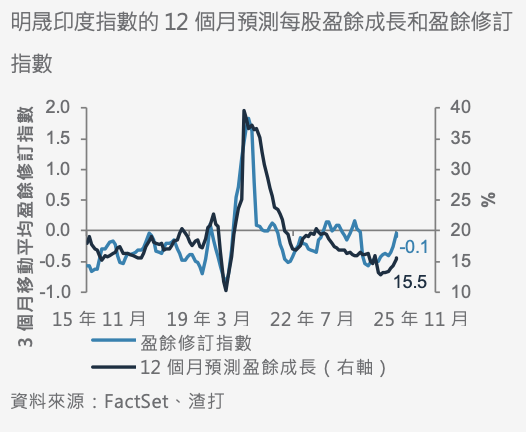 我們也預期投資者將重新關注印度股票。在利潤成長放緩和關稅壓力下,印度市場的評價面溢價年初至今已經回落,但不利因素正在減弱。2025年第三季國內生產總值成長為年增率8.2%,遠超預期。近期推出的寬鬆貨幣政策稅務改革有助支持經濟成長,並重振盈餘成長。盈餘修訂指數已從負值區域回升,12個月預測每股盈餘成長為15.5%,超越了亞洲的大部分地區。