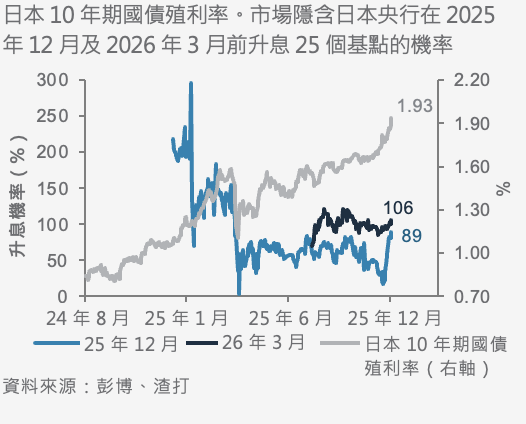 儘管30年期國債拍賣強勁短暫地限制了長期殖利率 —— 10年期國債殖利率維持在約1.93%,30年期國債殖利率接近3.42% —— 但我們仍然預期,隨著政策正常化推高無風險利率,並重建期限溢價,日本國債殖利率將逐步上升,最終推動10年期國債殖利率接近2%。