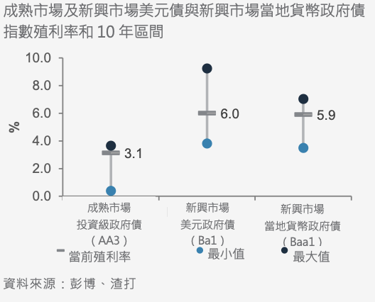 新興市場當地貨幣與美元政府債的名義殖利率較成熟市場債具吸引力