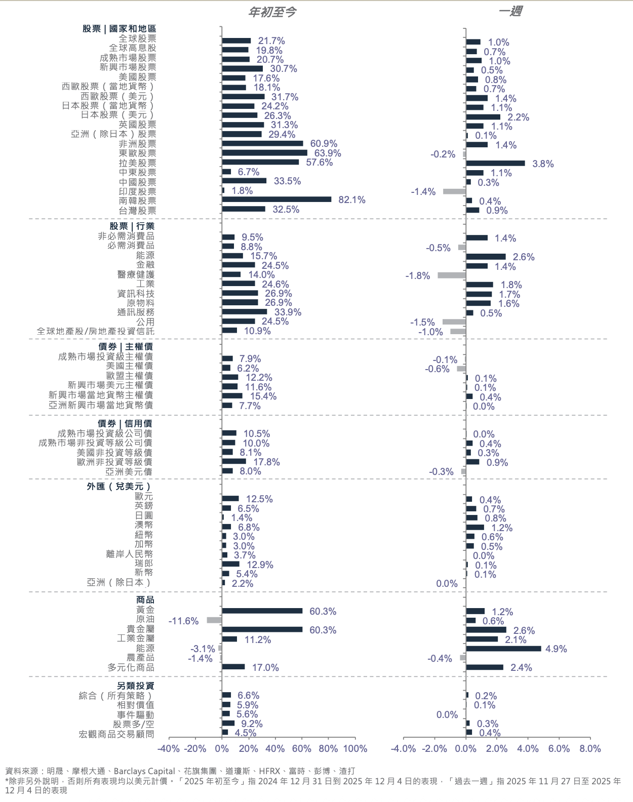 黃金今年表現有望大幅超越全球股票和債券,步入2026年,在不確定性的籠罩下,仍然是與股票並列的首選資產。詳情請留意我們將於12月12日發布的《2026年全年展望》。