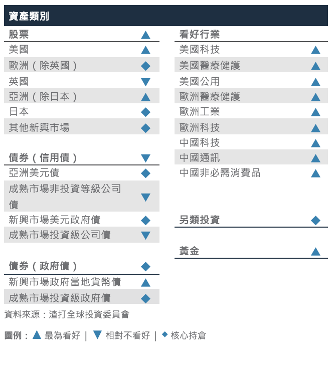 強烈看好黃金和股票:我們對黃金與股票在新一年的表現仍持樂觀態度,預期新興市場央行將持續購入黃金,聯準會降息將推動美國經濟軟著陸,以及人工智慧驅動企業的盈餘成長。美國股市評價面過高以及人工智慧發展的前景面臨挑戰,可能導致市場波動,但我們建議在回調時增持。我們也仍然看漲亞洲(除日本)股票,尤其偏好中國與印度股市,兩者分別提供了具吸引力的評價面與成長機會(見第4頁)。