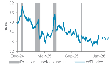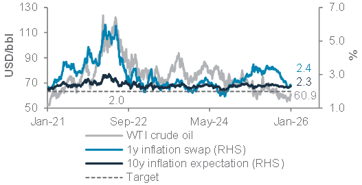Softer-than-expected US inflation. US December core consumer prices rose 0.2% m/m vs. 0.3% expected. On a yearly basis, core prices rose 2.6% y/y vs. 2.7% expected and unchanged from November’s four-year low. A soft job market, reinforced in the Fed’s latest Beige Book survey, is likely to sustain wage and shelter disinflation, while last year’s acceleration in productivity offsets the impact of tariffs on goods inflation. Barring a spike in oil prices (see below), we expect inflation to gradually decline this year, as is reflected in one-year inflation swaps which has fallen to 2.4%. Long-term inflation expectations also remain subdued (see chart above).