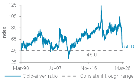 The gold-silver ratio is nearing levels that have historically coincided with more stable troughs, outside the 2011 extreme