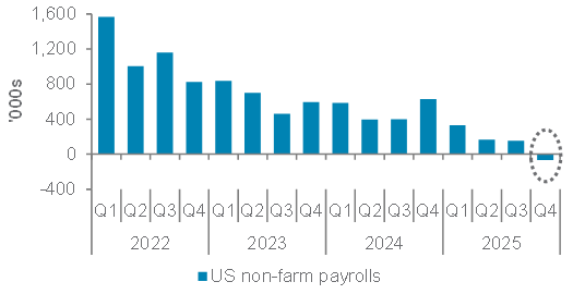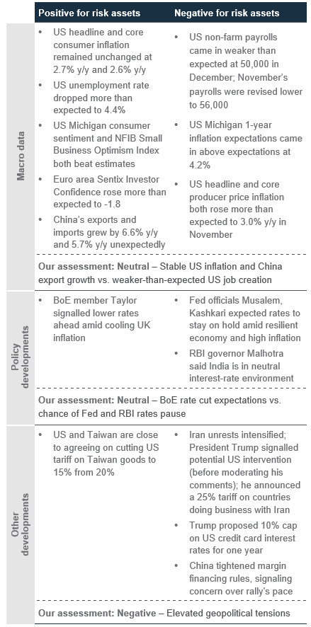 Stalling US job market. The US job market contracted in Q4, the first such quarterly retrenchment since the COVID crisis in early 2020. In December, 50,000 non-farm jobs were generated net (vs. 70,000 expected) and prior two months payrolls were revised downward, extending a pattern of downward revisions throughout 2025. Tight supply of workers due to immigration curbs lowered the jobless rate to 4.4%, although the rate remains above the Fed’s long-run equilibrium rate of 4.2%.