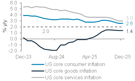 US core consumer inflation remained unchanged at 2.6% y/y in December, slightly below estimates; both core goods and core services inflation fell