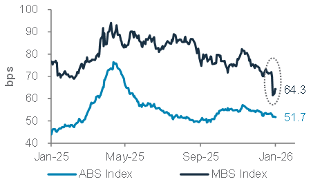 Rationale: Mortgage-backed Securities (MBS) Index credit spreads tightened by about 10bps before easing slightly following the announcement of a government-sponsored enterprise (GSE) purchase programme on 8 January, which represents roughly 2% of the overall MBS market. The programme aims to lower mortgage rates and improve consumer affordability. However, both Fannie Mae and Freddie Mac face portfolio caps of USD 225bn each, which limit their ability to retain or add MBS unless these caps are raised.
