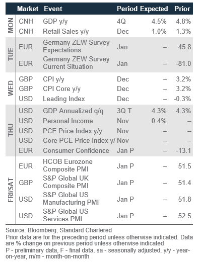 The USD Index (DXY) has held near 99 (its 50-day moving average) recently, showing little response to geopolitical uncertainty in Iran and Venezuela. Instead, it remains glued to the US 10-year government bond yield for direction. We expect the USD to remain rangebound until a new catalyst provides direction.