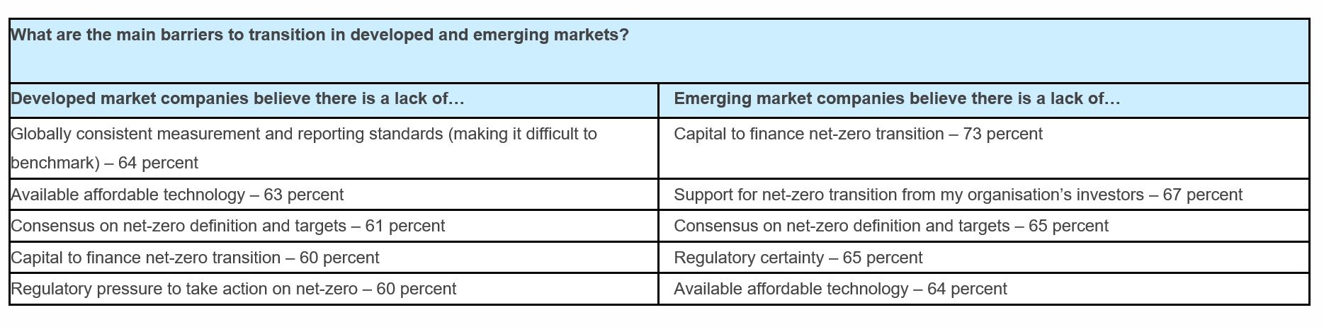 - Most companies are delaying transition because they do not feel they are currently equipped to meet the target. Some 53 percent said they need extensive organisational change before tackling net-zero.